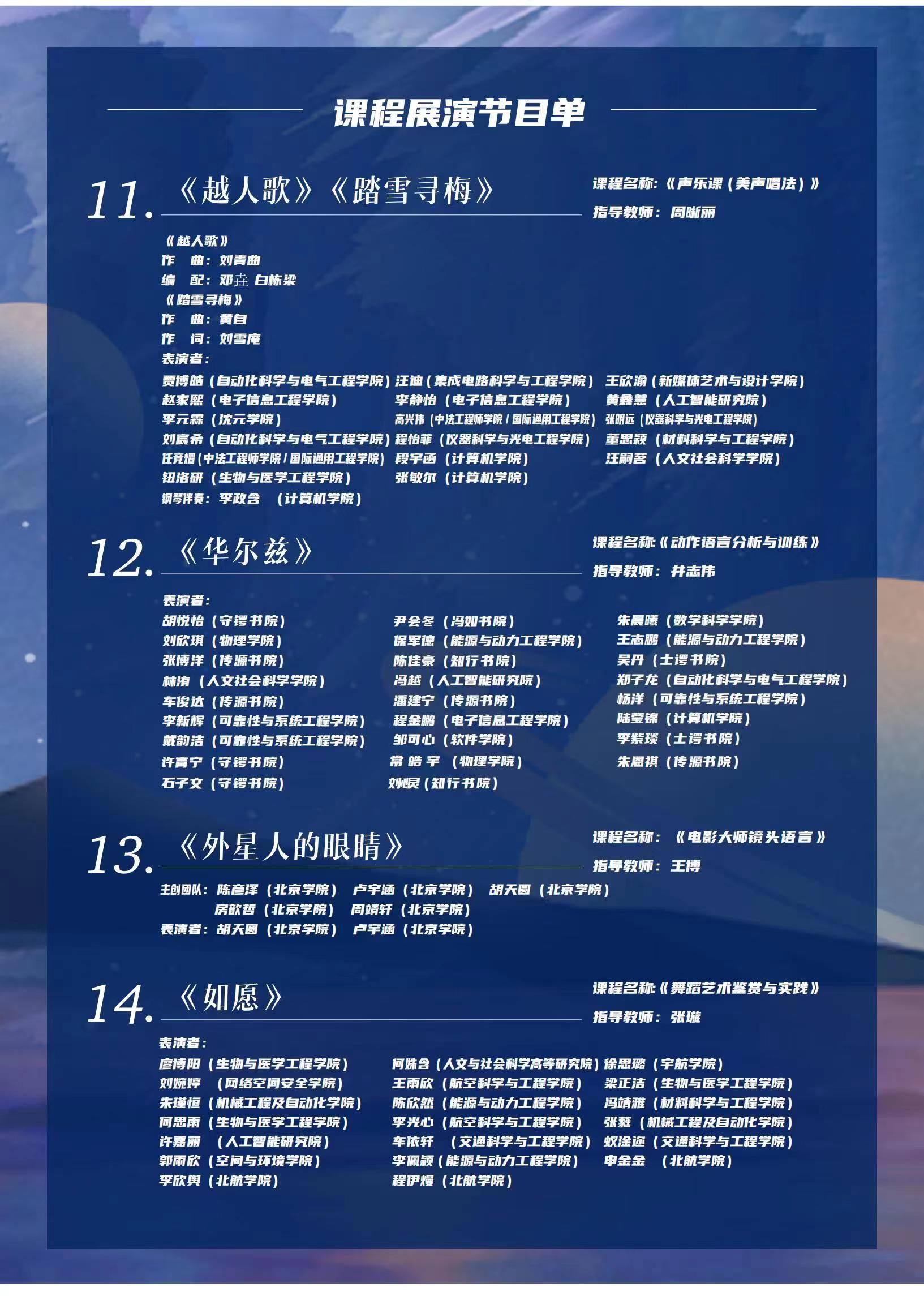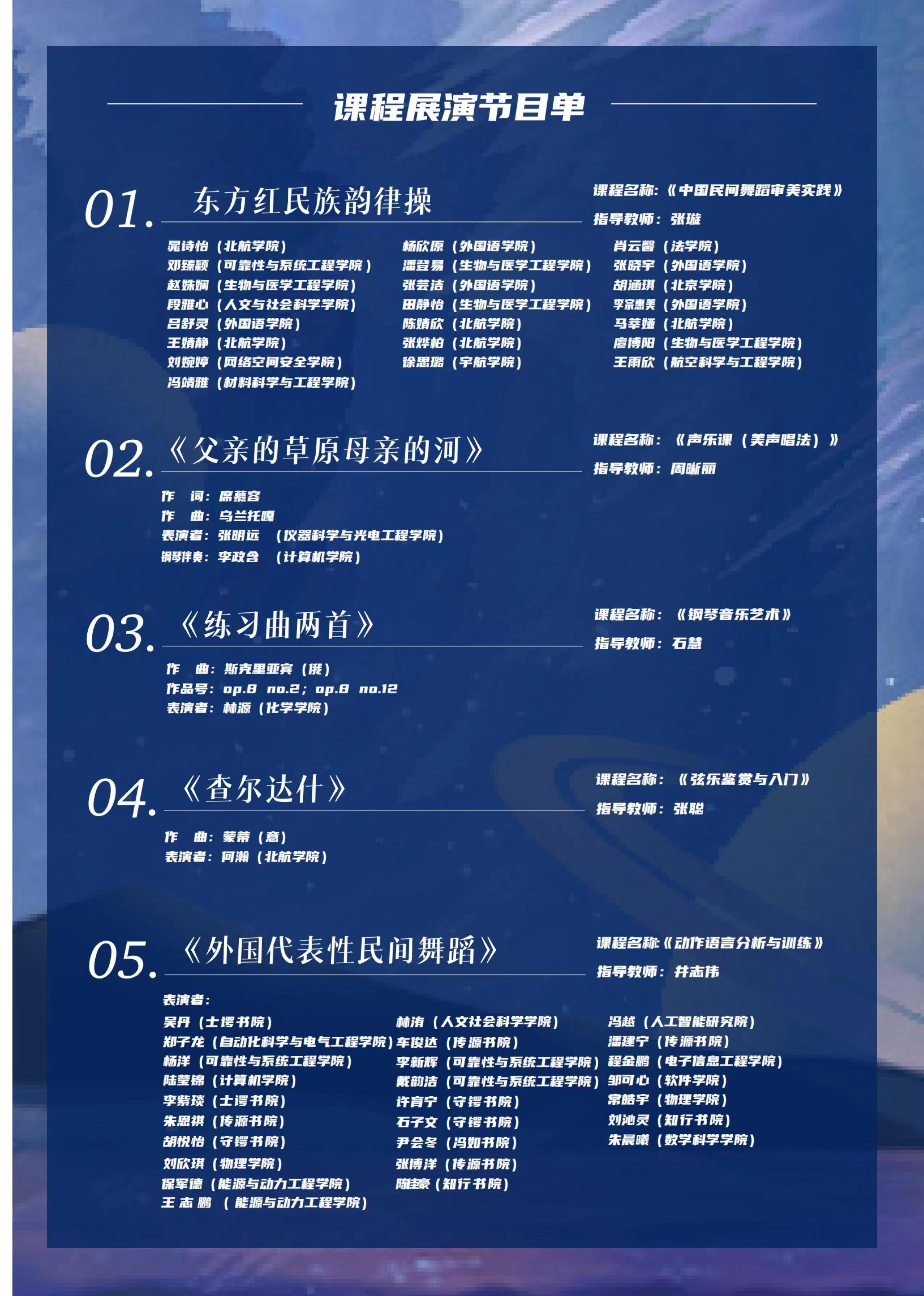 北航美育中心2023年音樂、舞蹈、影視美育課程聯合匯報展演的主題為《如愿》,此次課程展演涉及美育中心8名教師的13門課程,參與學生表演人數為91人,在展示美育課堂的同時,體現立德樹人的核心思想。意在通過藝術浸潤的方式,讓北航莘莘學子銘記“航空救國”的歷史,致敬老一輩航空航天事業的建設者們,傳承其艱苦樸素、勤奮好學、全面發展、勇于創新的美好精神,踐行“德才兼備,知行合一”的校訓,擦亮北航人“空天報國”的精神底色,愿北航的青年人不負先驅們所愿,努力奮斗,砥礪前行,佑祖國山河無恙,煙火尋常,如其所愿。