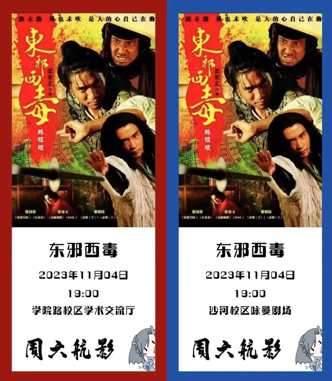 11月4日(周六)19:00,《東邪西毒》將于學院路校區學術交流廳和沙河校區詠曼劇場同步放映!