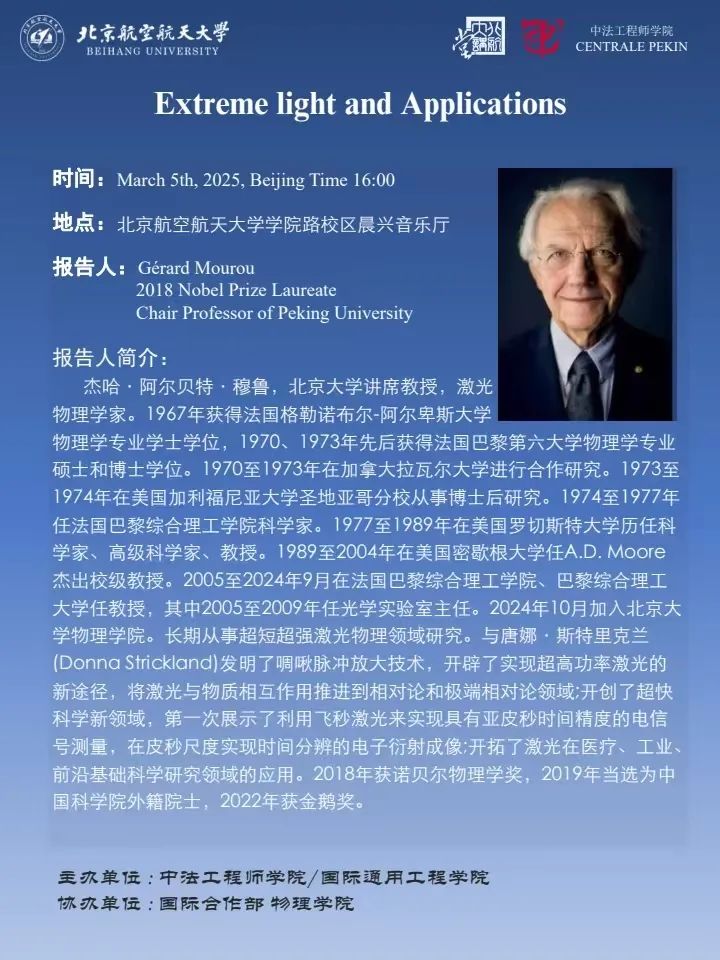 為紀(jì)念學(xué)院建院20周年,在國(guó)際合作部和物理學(xué)院的支持下,中法工程師學(xué)院/國(guó)際通用工程學(xué)院邀請(qǐng)到2018年物理學(xué)諾貝爾獎(jiǎng)獲得者Gérard Mourou,做客北航探討極端光學(xué)及其應(yīng)用,