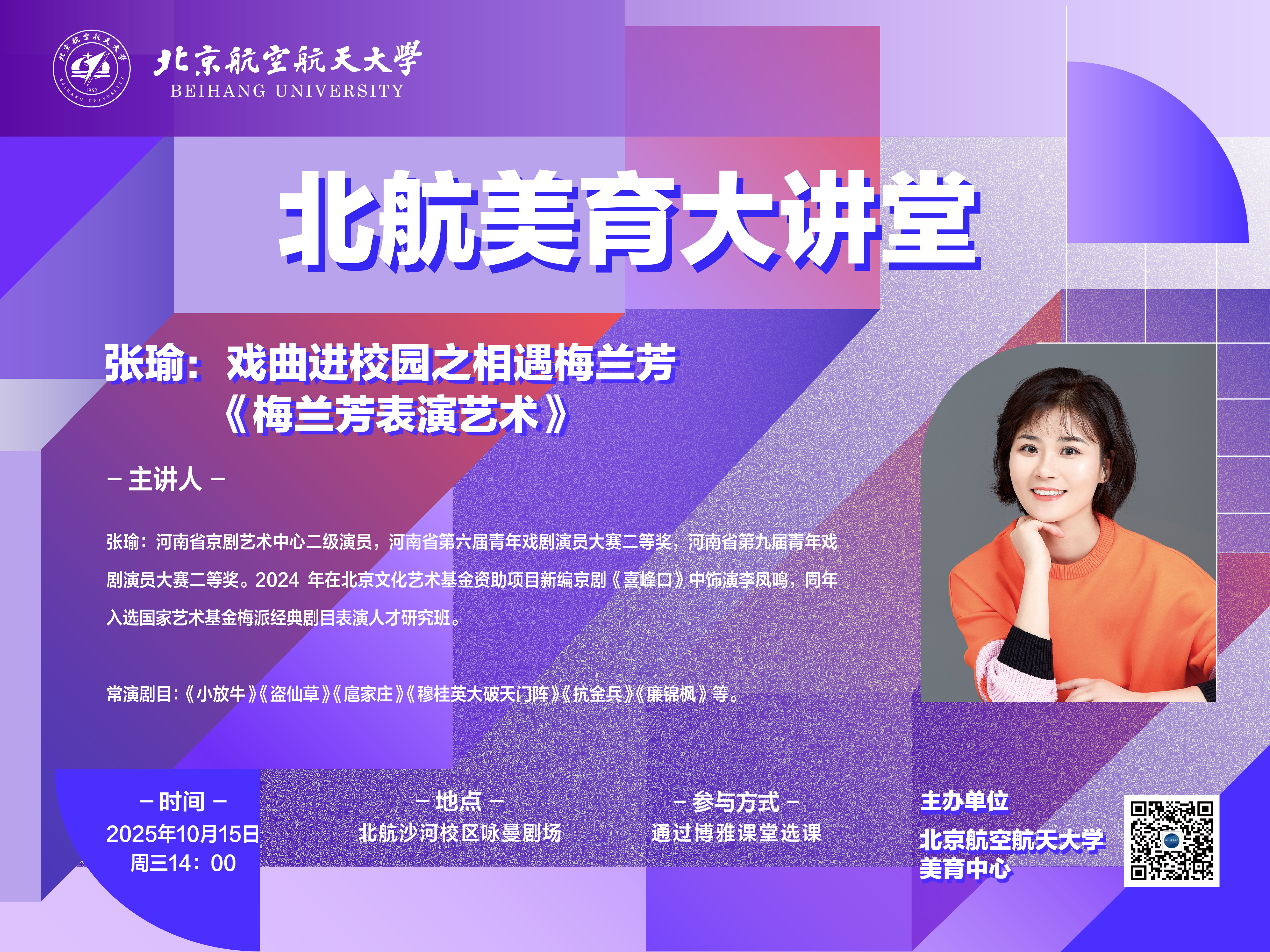“相遇梅蘭芳”北京高校之旅,將以講座為主要形式,輔以演出、展覽參觀、沉浸體驗等多重形式,以“知戲,感戲,聽戲,看戲”的理念,引領(lǐng)在校大學(xué)生感受戲曲文化、普及戲曲知識、享受戲曲藝術(shù)之美。